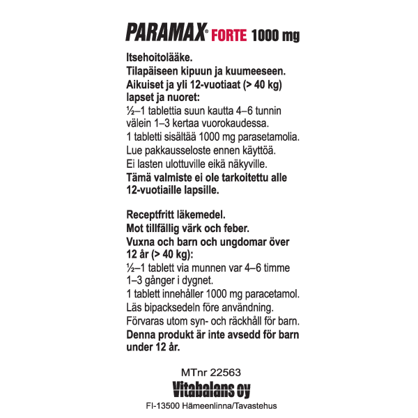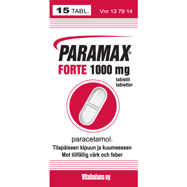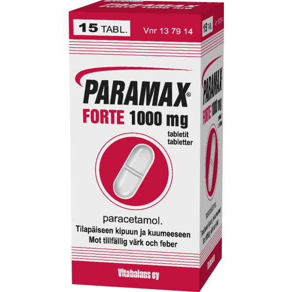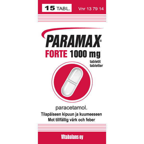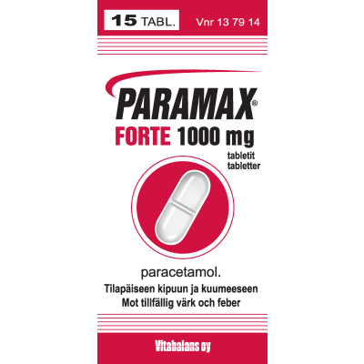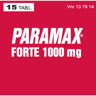 Paramax Forte on 1000 mg eli 1 gramman vahvuinen parasetamolivalmiste itsehoidossa. Parasetamolia käytetään mm. lihas-, hammas- ja päänsärkyyn, kuukautiskipujen hoitoon sekä tilapäisiin muihin kipuihin virusten aiheuttaman nuhakuumeen ja influenssan yhteydessä. Parasetamoli ei ärsytä ruoansulatuskanavaa ohjeen mukaisessa käytössä. Alle 12-vuotiaille (alle 40 kg painaville) ja pitkäaikaiseen käyttöön vain lääkärin määräyksestä.