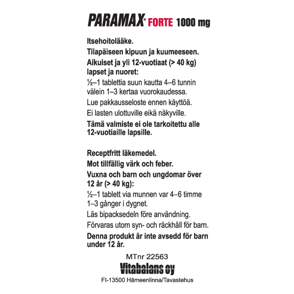 Itsehoidossa aikuisten ja yli 12-vuotiaiden (yli 40 kg painoisten) lasten annostus on ½-1 tablettia (500-1000 mg) 4-6 tunnin välein korkeintaan 3 kertaa päivässä. Maksimiannos on 3 tablettia (3000 mg) päivässä.