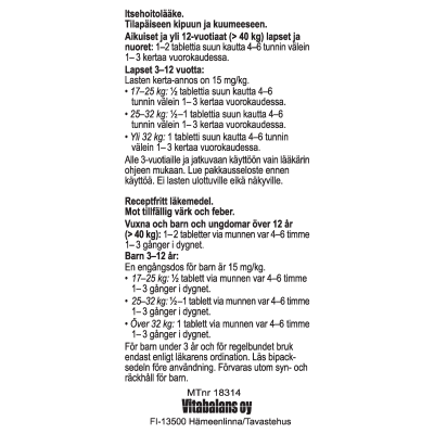 Lääkepakkauksen tai lääkärin suosittamia annostuksia ei saa ylittää, sillä parasetamolin liika-anto voi aiheuttaa maksavaurion. Jatkuvaan käyttöön vain lääkärin ohjeen mukaan. Samanaikaisesti ei saa käyttää muita parasetamolia sisältäviä valmisteita.