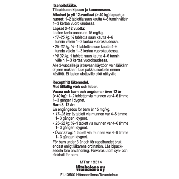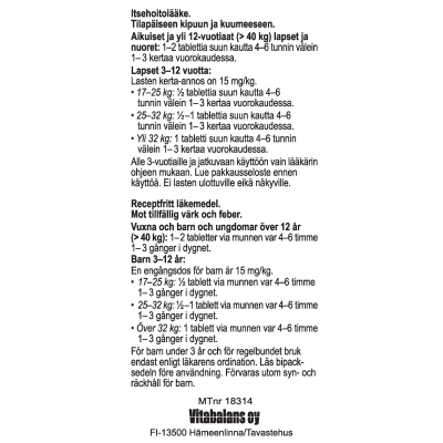 Lääkepakkauksen tai lääkärin suosittamia annostuksia ei saa ylittää, sillä parasetamolin liika-anto voi aiheuttaa maksavaurion. Jatkuvaan käyttöön vain lääkärin ohjeen mukaan. Samanaikaisesti ei saa käyttää muita parasetamolia sisältäviä valmisteita.