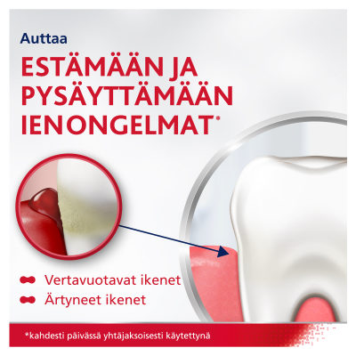 Harjaa hampaat kahdesti, korkeintaan kolmesti päivässä. Vältä tuotteen nielemistä ja sylje pois. Käänny hammaslääkärin puoleen, jos oireet jatkuvat tai pahenevat tai jos lapsen ikenet vuotavat verta.