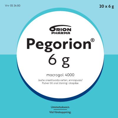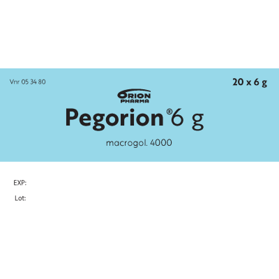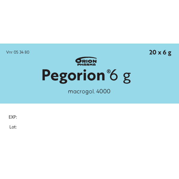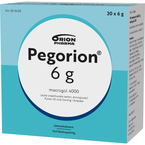 Pegorion 6 g ja 12 g jauhe oraaliliuosta varten on ummetuksen hoitoon sekä kuivuneen, suolessa pitkään olleen ulostemassan (ulostetukkeuma) pehmentämiseen tarkoitettu valmiste. Vaikuttava aine makrogoli 4000 sitoo vettä, jolloin suolen sisällön vesimäärä lisääntyy ja ulostemassa pehmentyy.