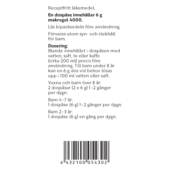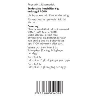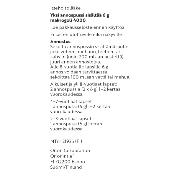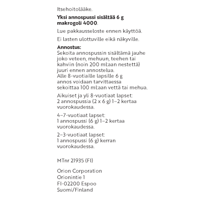 Tavallinen annos ulostekovettuman pehmentämiseen aikuisille ja yli 12-vuotiaille lapsille on 5-10 (12 g) annospussia eli 1-2 litraa vuorokaudessa, 1-3 vuorokauden ajan.