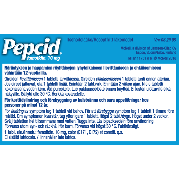 Pepcid-tabletti lievittää närästystä ja muita liikahappoisuuteen (esim. happamat röyhtäisyt) liittyviä oireita. Pepcidin vaikuttava aine on famotidiini, joka kuuluu histamiini-(H2)-reseptorin salpaajiin. Pepcid vaikuttaa vähentämällä mahahapon eritystä eli siis hoitaa itse (närästys)ongelman syytä. Yksi tabletti lievittää oireita noin 30 minuutin kuluttua annostelusta. Se myös ehkäisee oireita kun se otetaan tuntia ennen ruokailua. Alle 12-vuotiaille ja pitkäaikaiseen käyttöön vain lääkärin määräyksestä.
