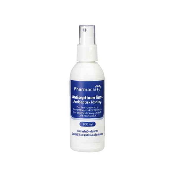Pharmacare Antiseptinen liuos soveltuu haavojen ja nirhaumien desinfiointiin. Tuote sisältää myös ihoa hoitavaa allantoiinia.