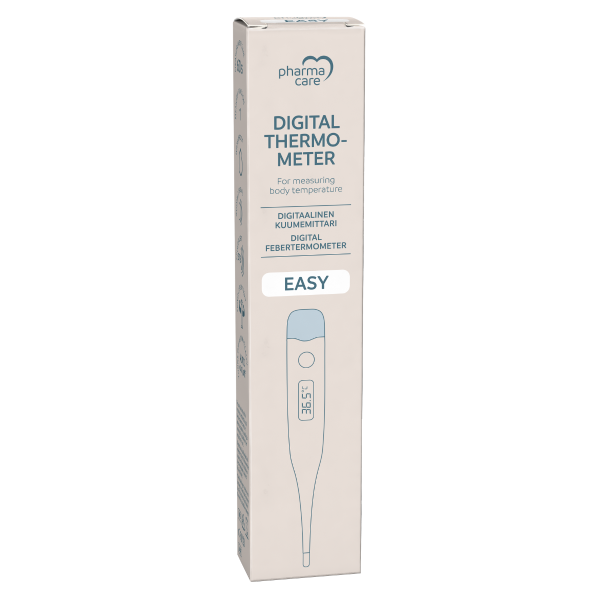 Pharmacare digitaalinen kuumemittarissa on äänimerkki, muisti, kuumehälytys (yli 37,5°C) ja paristonvaihtomahdollisuus (LR41). Mittari kytkeytyy automaattisesti pois päältä 10 minuutin kuluttua.