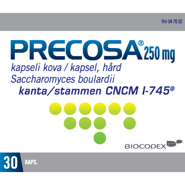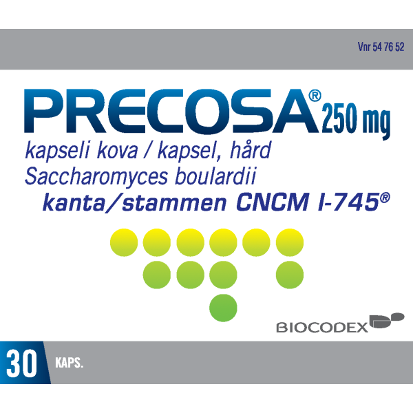 Precosaa käytettään itsehoidossa ripulin hoitoon sekä antibioottihoidon aiheuttamiin suolen tulehduksiin/ripulitiloihin ja antibioottihoidon aikana estämään ripulia. Precosa sisältää kylmäkuivattua hiivasientä (Saccharomyces boulardii), joka estää bakteerien haitallisia vaikutuksia suolen limakalvolla. Precosa korjaa mikrobiston epätasapainoa.