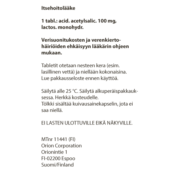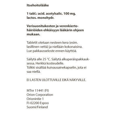 Lääkärin ohjeen mukaan. Tyypillinen annos on 100-300 mg päivässä. Sydäninfarktin ensiapuna otetaan yleensä 250–500 mg.