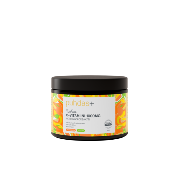 Tillsatsfri, magvänlig och stark C-vitamin. C-vitamin hjälper till att minska trötthet och utmattning. C-vitamin främjar immunsystemets normala funktion, även under och efter intensiv träning. C-vitamin främjar normal kollagenbildning för normal funktion av blodkärl, skelett, brosk, tandkött, hud och tänder. C-vitamin främjar normal funktion av nervsystemet och normala psykologiska funktioner. Puhdas+ -produkter är högkvalitativa kosttillskott. I tillverkningen används inga extra ingredienser, såsom konserveringsmedel, färgämnen och ytbehandlingsmedel.