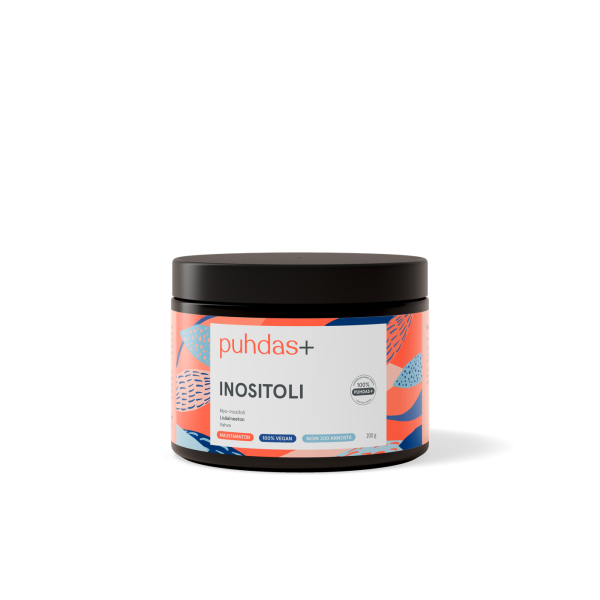 Stark och 100 % tillsatsfri Puhdas+ myo-inositolprodukt. Inositol är en vattenlöslig förening som kroppen syntetiserar från glukos. Det klassificeras som en så kallad vitaminliknande förening.