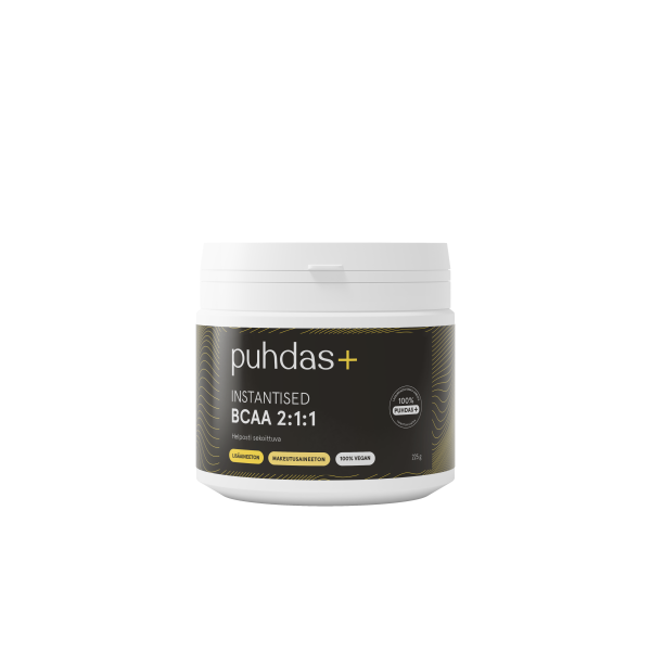 Puhdas+ Instantiserade BCAA Aminosyror 100 % eller grenade aminosyror är ett gemensamt namn för tre aminosyror: leucin, isoleucin och valin. Dessa tre aminosyror tillhör de essentiella aminosyrorna som människokroppen inte kan bilda själv. Pulvret är i "Instantiserad" form vilket innebär att det löser sig omedelbart och aminosyrorna är därmed snabbt tillgängliga för kroppen. Laktosfritt, glutenfritt, jästfritt, sockerfritt, veganskt.