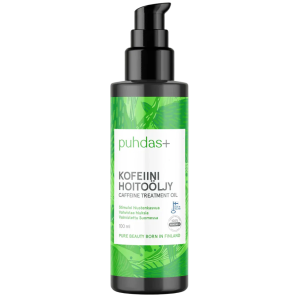 Puhdas+ Kofeiini Hoitoöljy hiuspohjalle on monivaikutteinen hoitoöljy, joka tukee hiuspohjan hyvinvointia ja hiusten luonnollista kasvua. Kofeiini stimuloi hiuspohjan verenkiertoa, mikä auttaa aktivoimaan hiusten kasvusykliä ja vahvistamaan hiuksia juuresta alkaen.