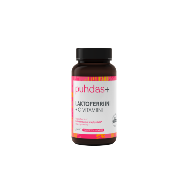 Puhdas+ Laktoferriini + C-vitamiini yhdistää elimistölle luontaisen laktoferriinin ja C-vitamiinin tukemaan immuunijärjestelmän normaalia toimintaa. C-vitamiini edistää vastustuskykyä ja auttaa suojaamaan soluja hapettumisstressiltä. Laktoferriini on elimistössä luonnostaan esiintyvä proteiini, jota käytetään osana kokonaisvaltaista hyvinvointia.