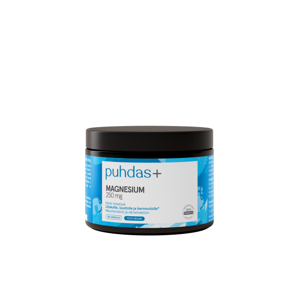 *Magnesium edistää hermoston ja lihasten normaalia toimintaa sekä luuston ja hampaiden pysymistä normaaleina. Magnesium edistää normaaleja psykologisia toimintoja ja elektrolyyttitasapainoa.
