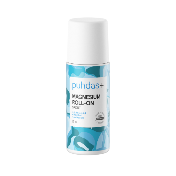 Puhdas+ Magnesium Roll-on är en stark magnesiumprodukt för leder och muskler för extern användning. Sprayen innehåller förutom magnesium växtbaserad glukosamin, mentol och effektiv arnikautdrag.