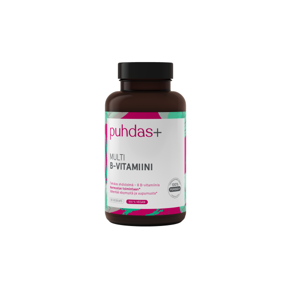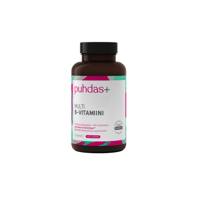 Puhdas+ Multi B-vitamin är den perfekta lösningen för olika behov, som erbjuder en optimal kombination av 8 olika B-vitaminer. B1-, B2-, B3-, B6- och B12-vitaminer samt biotin främjar nervsystemets normala funktion. B2-, B3-, B6- och B12-vitaminer samt folat och pantotensyra hjälper till att minska trötthet och utmattning.