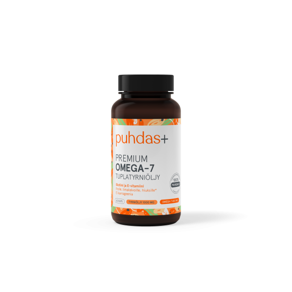 Puhdas+ Premium Omega-7 on vahva ja puhdas tuplatyrnivalmiste, joka sisältää tyrniöljyn arvokkaat ainesosat sekä siemenistä että hedelmästä. Puhdas+ Premium Omega-7 on tuotettu hellävaraisella hiilidioksiuutolla, joka takaa puhtaan tyrniöljyn 100 % luonnollisessa muodossa. Tuotteen sisältämä biotiini tehostaa tyrniöljyn vaikutusta limakalvoilla ja iholla.