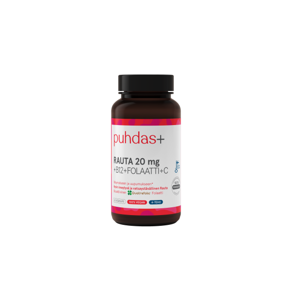 Vatsaystävällinen ja kasviperäinen rauta & B12-vitamiini & Folaatti & C on enemmän kuin rautavalmiste. Se sisältää raudan lisäksi punasolujen muodostamiseen tarvittava aineet, eli B12-vitamiinin, folaatin ja C-vitamiinin. Rautabisglysinaatti on yksi parhaiten siedetyistä rautayhdisteistä. Vähentääksemme suurta rautapitoisuutta suolen pinnassa rautabisglysinaatti ja C-vitamiini on pakattu rakeeseen, josta ne vapautuvat vähitellen rakeen kulkiessa suolistossa eteenpäin. Näin ei synny tilannetta kuten tavallisella rautavalmisteella, että koko rautamäärä vapautuisi yhteen paikkaan vatsalaukussa tai ohutsuolen alkuosassa. Lisäksi C-vitamiini parantaa raudan imeytymistä, kun ne vapautuvat rakeesta samaa tahtia.