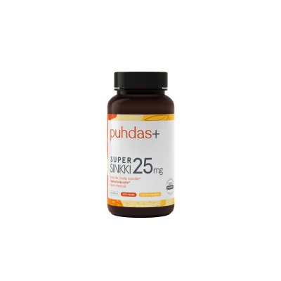 Puhdas+ Super Sinkki 25 mg on vahva ja hyvin imeytyvä sinkkivalmiste, joka tukee immuunijärjestelmän normaalia toimintaa, ihon hyvinvointia sekä hiusten ja kynsien kuntoa. Sinkki on elimistölle välttämätön hivenaine, jota tarvitaan mm. solujen uusiutumiseen, vastustuskykyyn ja normaaliin hormonitoimintaan.