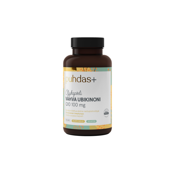 Puhdas+ Ubikinoni Q10 on korkealaatuinen koentsyymi Q10 -valmiste, jossa Q10 on liuotettu oliiviöljyyn hyvän imeytymisen varmistamiseksi. Ubikinoni osallistuu elimistön energiantuotantoon ja sopii erityisesti aikuisille, joiden Q10-tasot voivat laskea iän myötä.