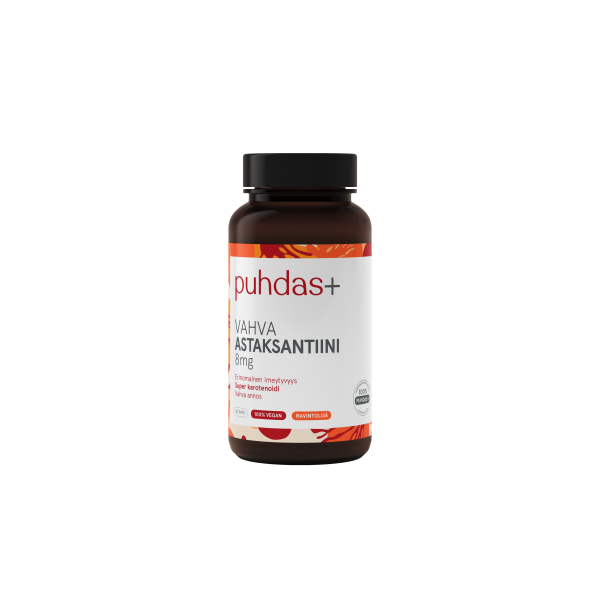 Puhdas+ Vahva Astaksantiini 8 mg on tehokas ja laadukas ravintolisä, joka sisältää luonnollista astaksantiinia. Astaksantiini on voimakas antioksidantti, jota käytetään tukemaan ihon, silmien ja lihasten hyvinvointia sekä kehon suojaa oksidatiivista stressiä vastaan.