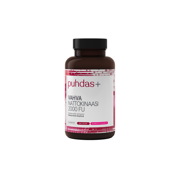 Puhdas+ Nattokinaasi on vahva ja hyvin imeytyvä natto-entsyymivalmiste, joka sisältää perinteisestä japanilaisesta natto-ruoasta saatavaa nattokinaasia. Vuorokausiannos sisältää 2000 FU nattokinaasia. Tuote on valmistettu Suomessa ja sen koostumus on puhdas – ilman turhia lisäaineita.