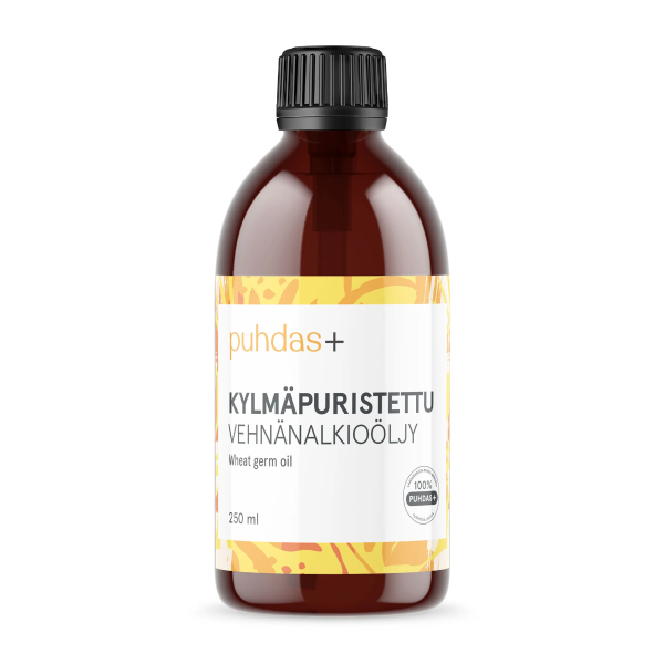 Puhdas+ Vehnänalkioöljy on ravinteikas kasviöljy, joka sisältää runsaasti E-vitamiinia ja välttämättömiä rasvahappoja. Se tukee ihon hyvinvointia sekä toimii monipuolisesti myös ruoanlaitossa ja kylmäkäytössä. Sopii sisäiseen ja ulkoiseen käyttöön.