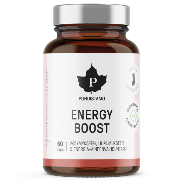 EnergyBoost on kokonaisvaltaisesti kehon energiantuotantoa tukeva yhdistelmävalmiste. Niasiini ja riboflaviini edistävät normaalia energia-aineenvaihduntaa ja auttavat vähentämään väsymystä ja uupumusta. Riboflaviini edistää myös punasolujen pysymistä normaaleina.