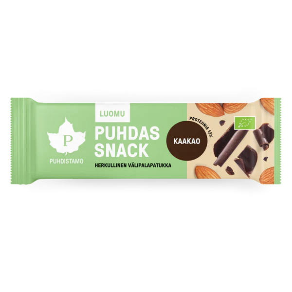 Puhdas Snack on laadukas välipalapatukka, joka on valmistettu ravitsevista luomusiemenistä. Patukka on makeutettu luomu agavesiirapilla ja viimeistelty luomusuklaalla.
