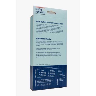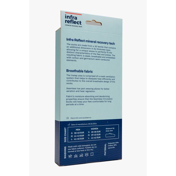Saumattomat verenkiertoa edistävät sukat on valmistettu 3D-tekstiilistä, jonka paksuuskerroksessa on lisäulottuvuus. Tämä mahdollistaa ainutlaatuisen kudoksen, joka tarjoaa asteittaisen kompression ja sopii täydellisesti jalkojen ja nilkkojen eri ominaisuuksiin. Tuloksena oleva kangas on sileä ja hengittävä ja siinä on hiili- ja germaniumpuolijohde-elementtejä, jotka edistävät jalkalihasten ja nivelten yleistä hyvinvointia. Tämän lisäksi kankaan kosteutta imevät ja hajua poistavat ominaisuudet varmistavat, että saumattomat verenkiertoa edistävät sukat pitävät jalkojesi olon mukavana.
