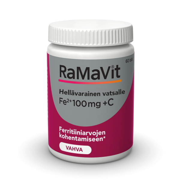 Ramavit Järn 100 mg är ett starkt järnpreparat, som är skonsamt för magen och avsett som stöd för kroppens hemoglobin- och ferritinvärden. Tabletten är lätt att svälja. Innehåller järnbisglycinat, vilket är ett organiskt aminosyrekelat, som är skonsamt för magen och i en form som direkt kan tas upp i kroppen. Detta järn försämrar inte heller upptaget av övriga spårämnen. Följaktligen kan tabletten tas både i samband med måltid och på tom mage. Varje tablett innehåller 100 mg aminosyrekelat av järn samt 80 mg vitamin C, som främjar upptaget av järn. Lämpar sig i samband med graviditet och amning. Även för veganer. Järn bidrar till normal bildning av röda blodkroppar och hemoglobin samt till normal syretransport i kroppen.
