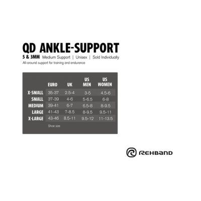 Rehband QD Ankelstöd 5 mm är ett flexibelt, mjukt och anatomiskt utformat stöd som lindrar smärta och stabiliserar området kring fotleden.