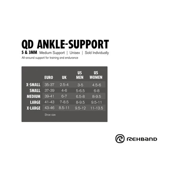 Rehbandin QD Ankle Support 5 mm on joustava, pehmeä ja anatomisesti muotoiltu tuki, joka lievittää kipua ja vakauttaa nilkan nivelten aluetta. Nilkkatuki on luokiteltu lääketieteelliseksi tuotteeksi, joten se on suunniteltu suojelemaan jalkaasi vammoilta sekä nopeuttamaan paranemista. Tämä tuki tarjoaa erinomaisen kompression ja lämpöä, jotka parantavat verenkiertoa ja vähentävät nivelten jäykkyyttä. Mikäli etsit mukavan tuntuista tuotetta, huomaathan, että tässä tuotteessa on tarranauhakiinnitys, jonka ansiosta tuote on säädettävissä yksilöllisen istuvuuden takaamiseksi.