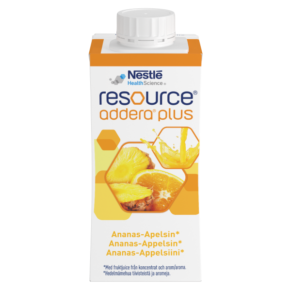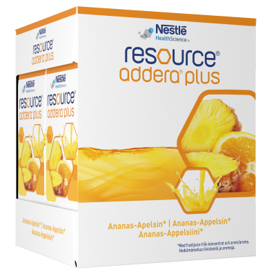 Resource® Addera Plus on kirkas, hedelmäinen ja runsasenerginen täydennysravintojuoma, joka voi auttaa vajaaravittuja tai sen riskissä olevia saamaan lisää energiaa ja ravintoa. Hyvä vaihtoehto potilaille, joilla on munuaisten vajaatoiminta, sekä rasvojen imeytymishäiriön yhteydessä. Ravintojuoma sisältää hedelmämehua, mikä antaa sille raikkaan ja hyvän maun. Saatavilla 6 raikasta makua! Resource® Addera Plus on tarkoitettu vajaaravittujen tai vajaaravitsemusriskissä olevien potilaiden ruokavaliohoitoon.