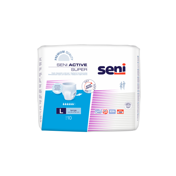 Seni Active Super housuvaipat on tarkoitettu henkilöille, joilla esiintyy kohtalaista virtsankarkailua. Housuvaippa mahdollistaa aktiivisen liikkumisen, mikä helpottaa mm. kuntoutumista. Housuvaippa on kertakäyttöinen ja se on helppo poistaa vaihdon yhteydessä repäisemällä sivusaumat auki. Elastinen vaippa mukautuu vartalon mukaan ja vaipassa oleva sivureuna suojaa ohivuodoilta. Hengittävä pintamateriaali päästää kosteuden ulos, mutta pitää nesteen sisällä, joten iho saa hengittää. Pehmeä pinta vähentää ärsytystä ja hankausta. EDS (Extra Dry System), lisäkerros pehmeän pinnan ja imevän ytimen välissä jakaa nesteen tasaisesti ja nopeasti ytimeen, pitää pinnan kuivana ja lisää käyttömukavuutta. Erittäin imukykyinen ydin (SAP) sitoo nesteen ja tuoksut sisäänsä. Neste geeliytyy, mikä vähentää bakteerien kasvua. Tuote on lateksiton. Housuvaipassa on indikaattori, joka ilmaisee, kun vaippa on aika vaihtaa. FRONT-merkintä vaipan etupuolella helpottaa vaipan pukemista oikein päin. Seni Active housuvaippoja voidaan käyttää alushousujen tapaan. Vyötärönympärys 100- 135 cm, koko L. Imukyky 1500 ml.