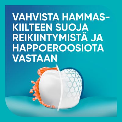 Auttaa rakentamaan 2x vahvemman suojan happoja vastaan ja suojaa reikiintymiseltä 24h ajan. Vahvistaa hammaskiillettä.