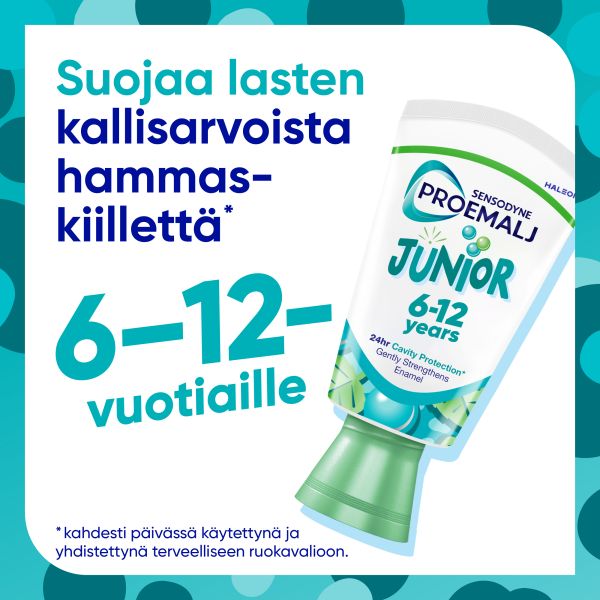 ProEmalj Junior on 6–12-vuotiaille lapsille tarkoitettu hammastahna päivittäiseen käyttöön. Se auttaa pitämään hampaat vahvoina ja terveinä vahvistamalla hammaskiillettä sekä suojaamalla lasten hampaita happohyökkäyksiltä ja reikiintymiseltä.