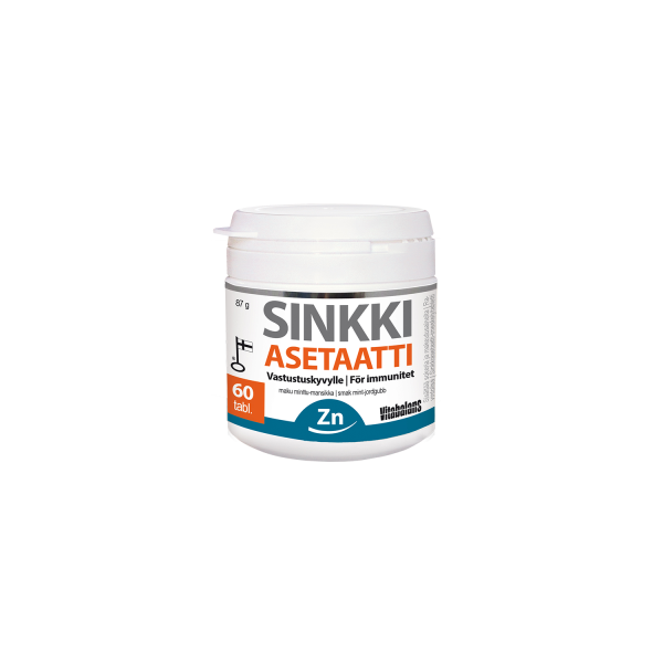 Sinkki Asetaatti on hyvänmakuinen sinkki-imeskelytabletti vastustuskyvylle. Tabletin sinkki on 100 %:sti sinkkiasetaattia. Makuvaihtoehtoina minttu-mansikka ja lakritsi.