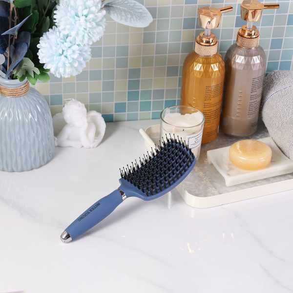 OVIA BLUE hårborste är med kombination av vildsvinshår och nylon samt antistatiska nylonpiggar. Ergonomiskt utformad. Ventilerande hårborste. Halkfri skaft.