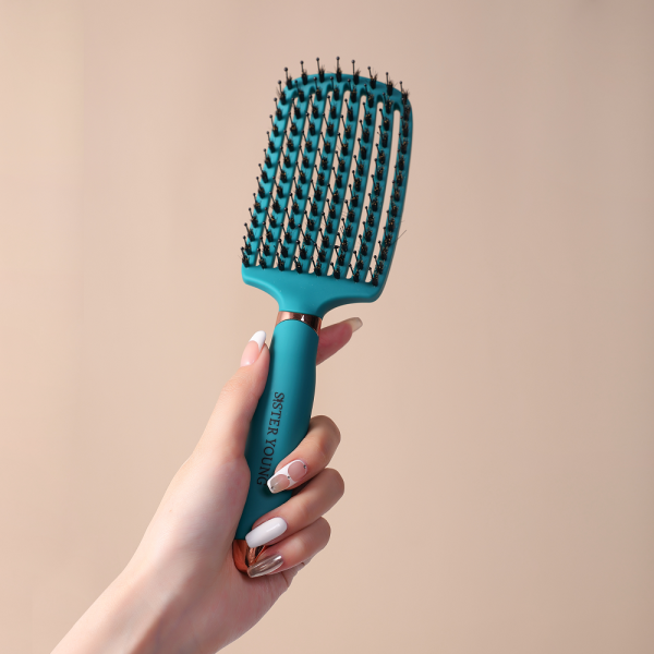 SisterYoung OVIA BLUE -selvitysharjassa on luonnonharjakset (wild boar) antistaattisilla nailonpäillä. Ergonomisesti muotoiltu. Harjan runko on ilmaa läpäisevä. Luistamaton varsi.