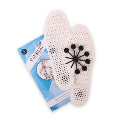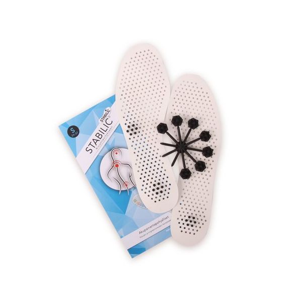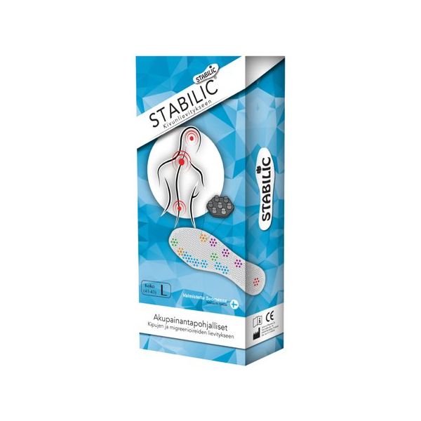 Stabilic Akupainantapohjalliset Stabilic akupainantapohjalliset ovat patentoitu itsehoitomenetelmä, joka on kehitetty perinteisten hoitotekniikoiden pohjalta. Jokaista kehon osaa vastaa jalkapohjassa tietty piste, jota stimuloimalla saadaan rentouttava vaikutus. Stabilic akupainantapohjalliset on suunniteltu lievittämään kipua stimuloimalla jalkapohjan refleksiopisteitä. Tuote sisältää pohjalliset kummallekin jalalle sekä rasterit, jotka voidaan kiinnittää pohjalliseen kivuntunteen mukaisiin kohtiin. Stabilic on suomalainen keksintö ja se on valmistettu Suomessa.