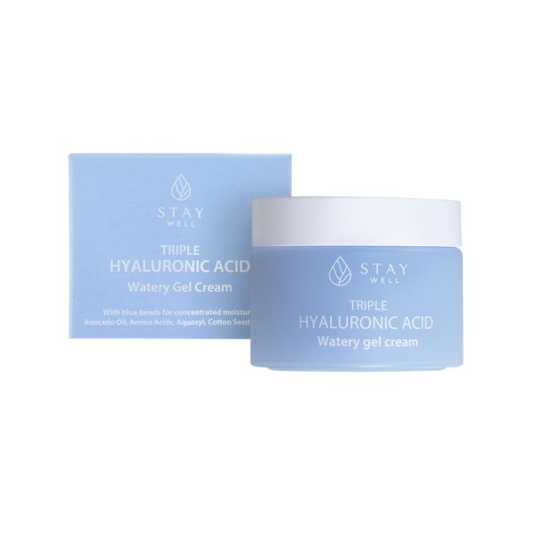 STAY WELL Triple Hyaluronic Acid Watery Gel Cream luo kosteusverhon suojaamaan ihoa ulkoisilta tekijöiltä ja vähentämään kosteuden menetystä. Siniset kapselit hajoavat iholla ja vapauttavat tiivistettyä kosteutusta, joka imeytyy suoraan ihoon. Hyaluronihappo on luonnollinen osa ihmisen ihoa, joka vähenee ikääntymisen myötä. Se voi sitouttaa vettä jopa 1000 kertaa oman painonsa verran ja kosteuttaa siksi tehokkaasti. Tämä tuote sisältää vegaanista hyaluronihappoa kolmessa eri molekyylikoossa optimaalisen imeytymisen, kosteutuksen ja veden sitomisen saavuttamiseksi.