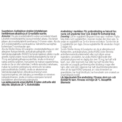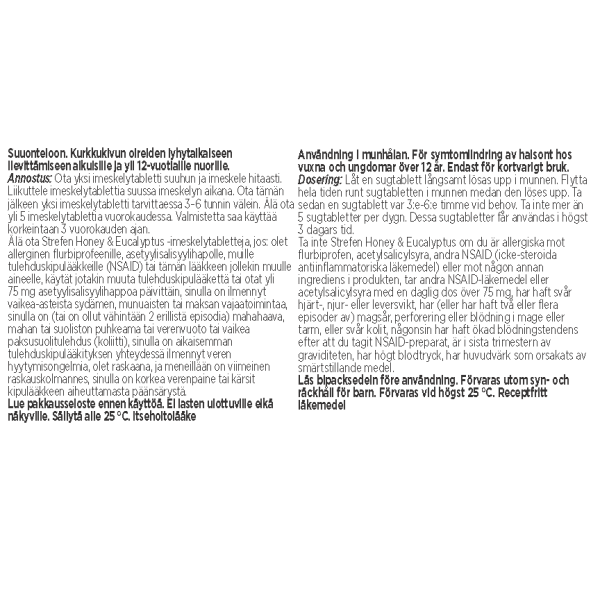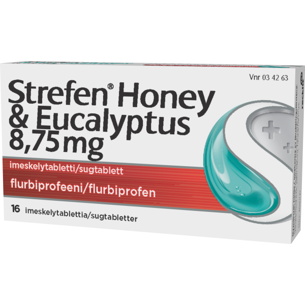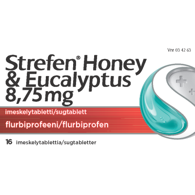 Strefen Honey & Eucakyptus sisältämä vaikuttava aine flurbiprofeeni on tulehduskipulääke. Strefen -imeskelytabletit on tarkoitettu aikuisille ja yli 12-vuotiaille lapsille lyhytaikaiseen käyttöön lievittämään kurkkukivun oireita, kuten esim. kurkun arkuutta, kipua ja turvotusta sekä nielemisvaikeuksia.