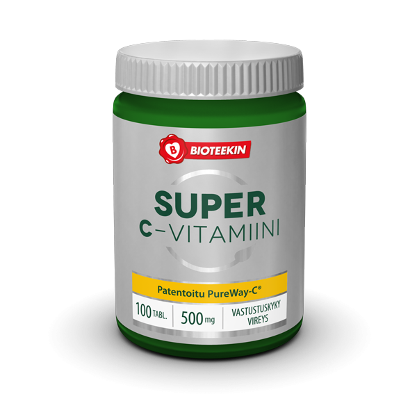 Super C-vitamiini sisältää ainutlaatuista C-vitamiiniyhdistettä, jossa on mukana rasvaliukoisia osasia ja bioflavonoideja. Tämä monipuolinen koostumus parantaa C-vitamiinin biologista hyväksikäytettävyyttä, nopeuttaen sen imeytymistä ja pidentäen sen pysymistä elimistössä. C-vitamiini edistää immuunijärjestelmän normaalia toimintaa ja normaaleja psykologisia toimintoja sekä auttaa vähentämään väsymystä ja uupumusta. C-vitamiini edistää myös raudan imeytymistä.