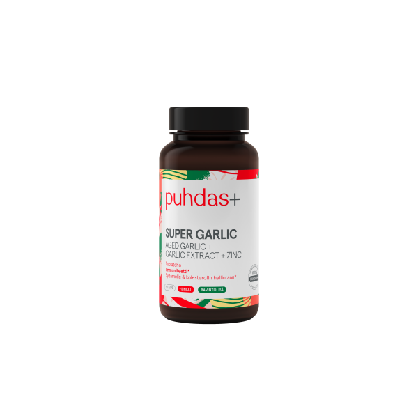Puhdas+ Super Garlic on tehokas yhdistelmä kylmäkypsytettyä valkosipulia (Aged Garlic) ja valkosipuliuutetta. Lisäksi valmiste sisältää *sinkkiä, joka tukee immuunijärjestelmän normaalia toimintaa.