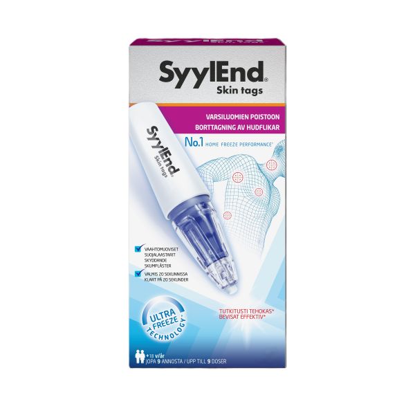 SyylEnd Skin tags mullistava kotihoito niskassa, kaulassa, rintakehällä, kainaloissa tai käsivarren sisäpuolella olevien varsiluomien poistamiseen. Se on ensimmäinen kotikäyttöön tarkoitettu varsiluomien hoitomenetelmä, jossa käytetään hyvin kylmää kaasua, typpioksiduulia.