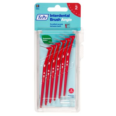 TePe Angle on suunniteltu hallittuun ja helppoon hammasvälien puhdistukseen. Harjan pää on pieni ja taivutettu, jotta se ulottuu helpommin takahampaiden väliin, sekä suulaen että kielen puolelta. Pitkällä, litteällä varrella saa hyvän ergonomisen otteen. TePe Angle on hyvä valinta, jos käsimotoriikka on heikentynyt. TePe Angle löytyy kuudessa värikoodatussa koossa, jotta se sopii kaikkiin hammasväleihin.Värikoodit ovat samat kuin Original-sarjassa. Kaikki koot on varustettu muovipäällysteisellä metallilangalla, joten hammasvälien puhdistaminen on hellävaraista ja turvallista. Etuja: Pieni taivutettu pää optimaaliseen ulottuvuuteen, pitkä, litteä varsi tekee harjasta helpon käsitellä, muovipäällysteinen metallilanka hellävaraiseen puhdistukseen.