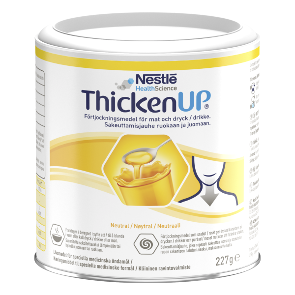 ThickenUp® on tärkkelyspohjainen sakeuttamisjauhe, joka muuttaa ruoan ja juomien koostumusta vaikuttamatta niiden makuun. Tarkoitettu henkilöille, joilla on nielemisvaikeuksia ja tarve sakeutetulle ruoalle ja juomalle.
