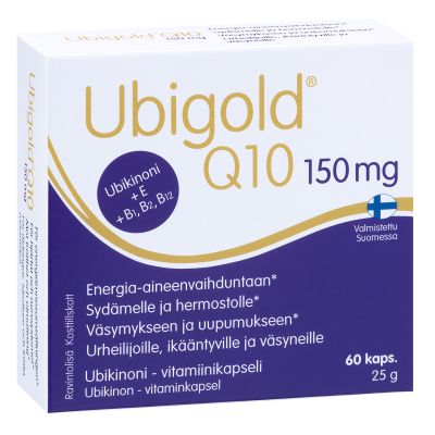 Ubigold® Q10 150 mg sisältää vaikuttavana aineena ubikinonia eli koentsyymi Q10:tä 150 mg yhdessä kapselissa. Ubikinoni on rasvaliukoinen, vitamiinin kaltainen aine, jota on elimistömme jokaisessa solussa. Valmisteesta hyötyvät erityisesti ikääntyvät, urheilijat, väsyneet ja toipilaat.