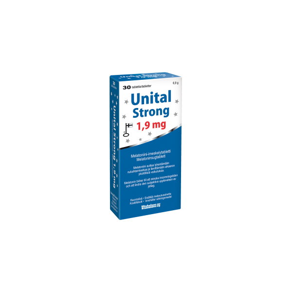 Melatoninsugtablett som hjälper att somna och lindrar effekterna av jetlag. Dosering: För vuxna 1 tablett dagligen sugas eller sväljas med vatten. Ta Unital Strong 1,9 mg -tabletten ett par timmar efter måltid. Dosen ska helst tas vid samma tidpunkt varje kväll. För att minska insomningstiden: För vuxna 1 sugtablett på kvällen nära läggdags. För att lindra effekterna av jetlag: För vuxna 1 sugtablett nära läggdags den första resdagen och under ytterligare några dagar efter ankomsten. Innehåll: Den rekommenderade dagliga dosen (1 tablett) innehåller: melatonin 1,9 mg Förteckning över ingredienser: Sötningsmedel (xylitol), ytbehandlingsmedel (magnesiumsalter av fettsyror), melatonin, arom (spearmint). Laktosfri, glutenfri, sockerfri. Innehåller inga animaliska ingredienser. Bör observeras: Kosttillskottet ersätter inte en balanserad och månsidig kost eller en hälsosam livsstil. Den rekommenderade dagliga dosen får inte överskridas. Inte för barn. Innehåller sötningsmedel. Överdriven